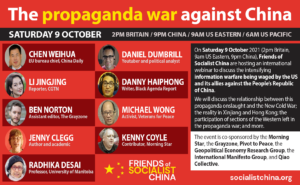 We’re excited to announced that our next webinar takes place on Saturday 9 October, 9am US Eastern / 2pm Britain / 9pm China. You can register for the Zoom event on Eventbrite. Details On Saturday 9 October 2021 (2pm Britain, 9am US Eastern, 9pm China), Friends of Socialist China are hosting an international webinar to discuss the intensifying information warfare being waged … Continue reading Webinar: The Propaganda War Against China (9 October)