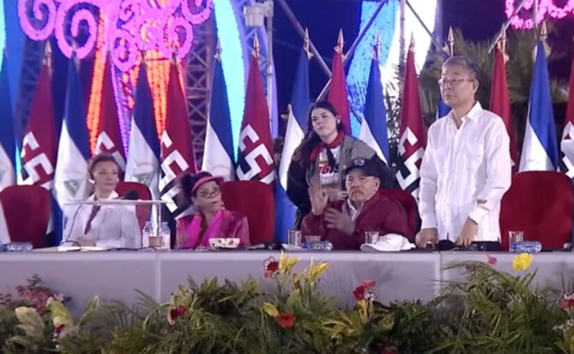 “First of all, if I may, I would like to convey the Greetings of General Secretary and President Xi Jinping to Co-President Comandante Daniel Ortega and Co-President Compañera Rosario Murillo. I would also like to convey the sincere greetings of all the 100 million Members of the Communist Party of China to our Sandinista Compañeras and Compañeros and to the Heroic People of Nicaragua.”