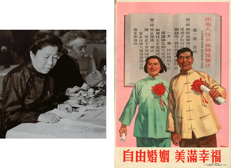 The centralized push to make the Marriage Law known throughout China would last until the end of 1953, but the efforts and materials put forth in the early days of the campaign would define attitudes toward marriage and women’s rights for decades to come. Indeed, the changes during this period can be summed up by the slogans featured in an old photograph, hung just behind the Beijing Linen Factory’s female workers: “Free marriage, mutual love and respect, hard work and production — these are what make for a happy home.”